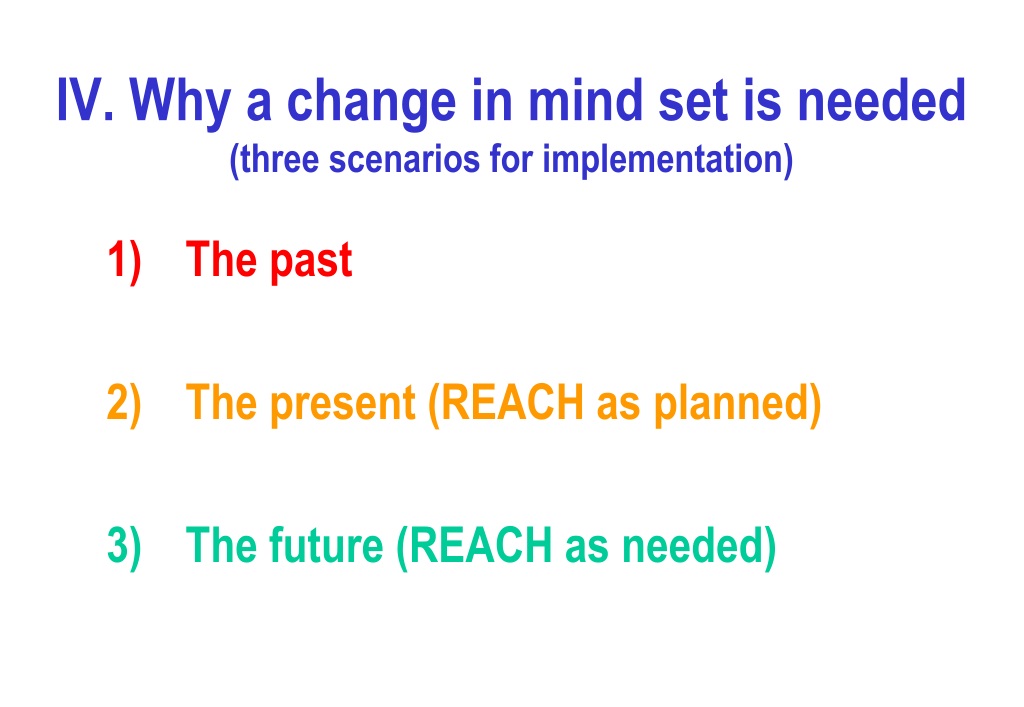IV. Why a change in mind set is needed(three scenarios for implementation) • The past • The present (REACH as planned) • The future (REACH as needed)