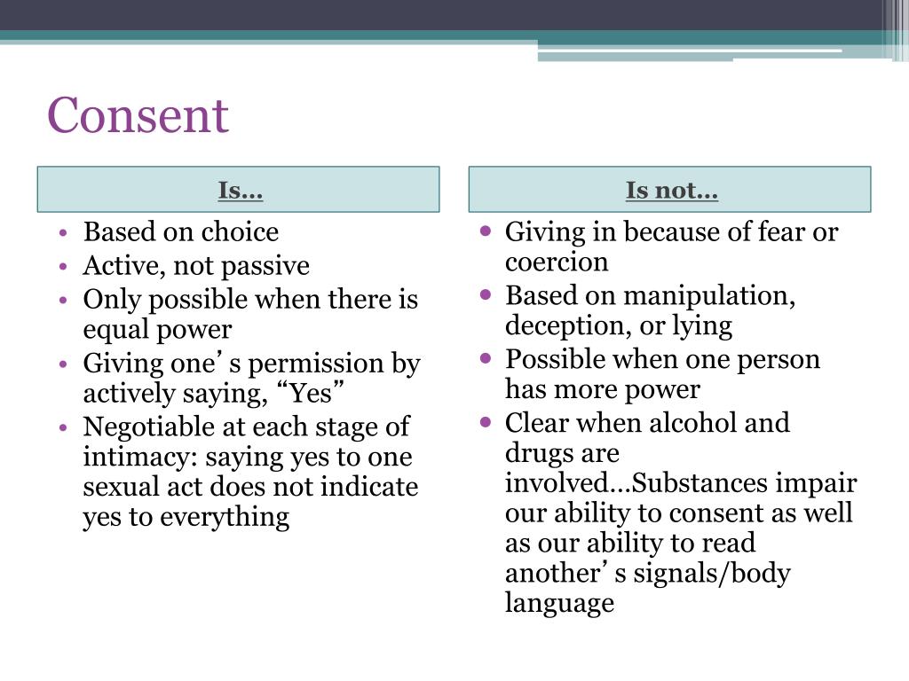 Consent Is… Is not… • Based on choice • Active, not passive • Only possible when there is equal power • Giving one’s permission by actively saying, “Yes” • Negotiable at each stage of intimacy: saying yes to one sexual act does not indicate yes to everything • Giving in because of fear or coercion • Based on manipulation, deception, or lying • Possible when one person has more power • Clear when alcohol and drugs are involved…Substances impair our ability to consent as well as our ability to read another’s signals/body language
