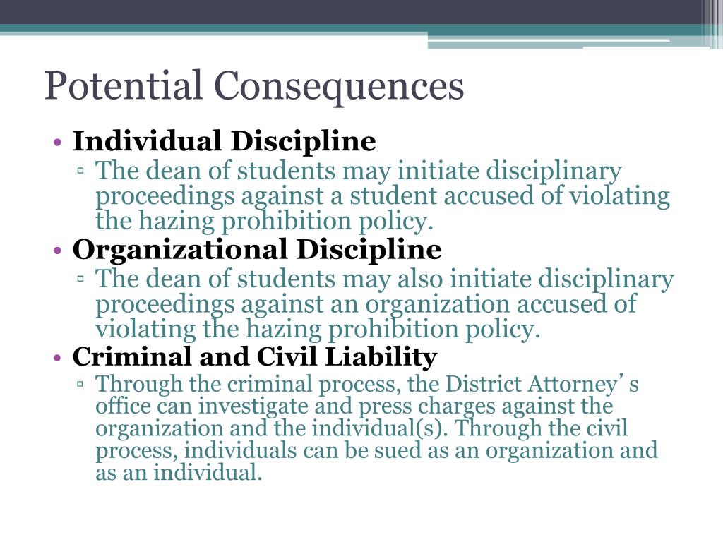 Potential Consequences • Individual Discipline • The dean of students may initiate disciplinary proceedings against a student accused of violating the hazing prohibition policy. • Organizational Discipline • The dean of students may also initiate disciplinary proceedings against an organization accused of violating the hazing prohibition policy. • Criminal and Civil Liability • Through the criminal process, the District Attorney’s office can investigate and press charges against the organization and the individual(s). Through the civil process, individuals can be sued as an organization and as an individual.