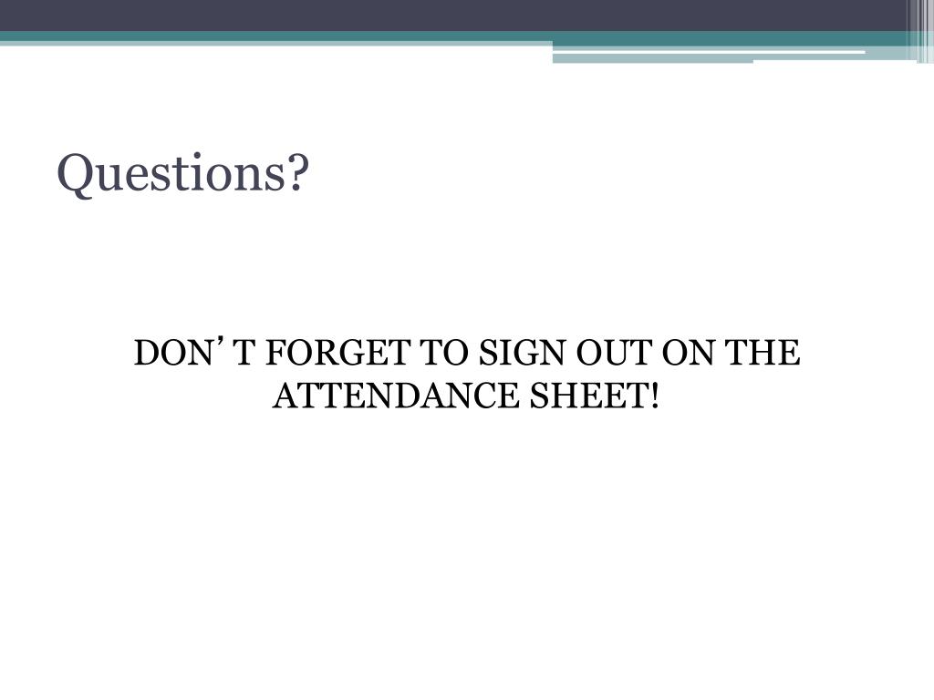Questions? DON’T FORGET TO SIGN OUT ON THE ATTENDANCE SHEET!
