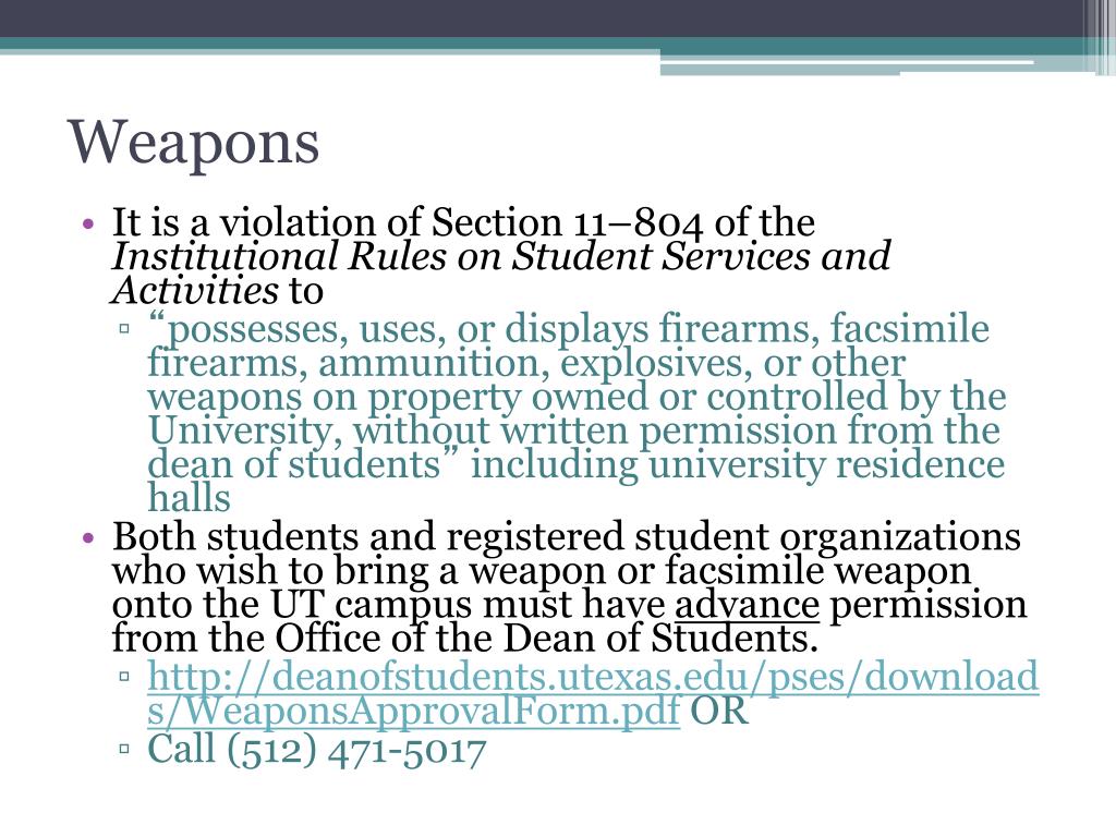 Weapons • It is a violation of Section 11–804 of the Institutional Rules on Student Services and Activities to • “possesses, uses, or displays firearms, facsimile firearms, ammunition, explosives, or other weapons on property owned or controlled by the University, without written permission from the dean of students” including university residence halls • Both students and registered student organizations who wish to bring a weapon or facsimile weapon onto the UT campus must have advance permission from the Office of the Dean of Students. • http://deanofstudents.utexas.edu/pses/downloads/WeaponsApprovalForm.pdf OR • Call (512) 471-5017