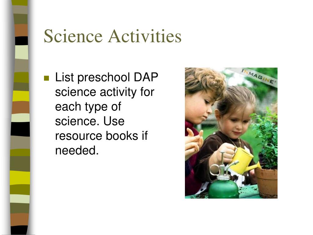 Science Activities • List preschool DAP science activity for each type of science. Use resource books if needed.