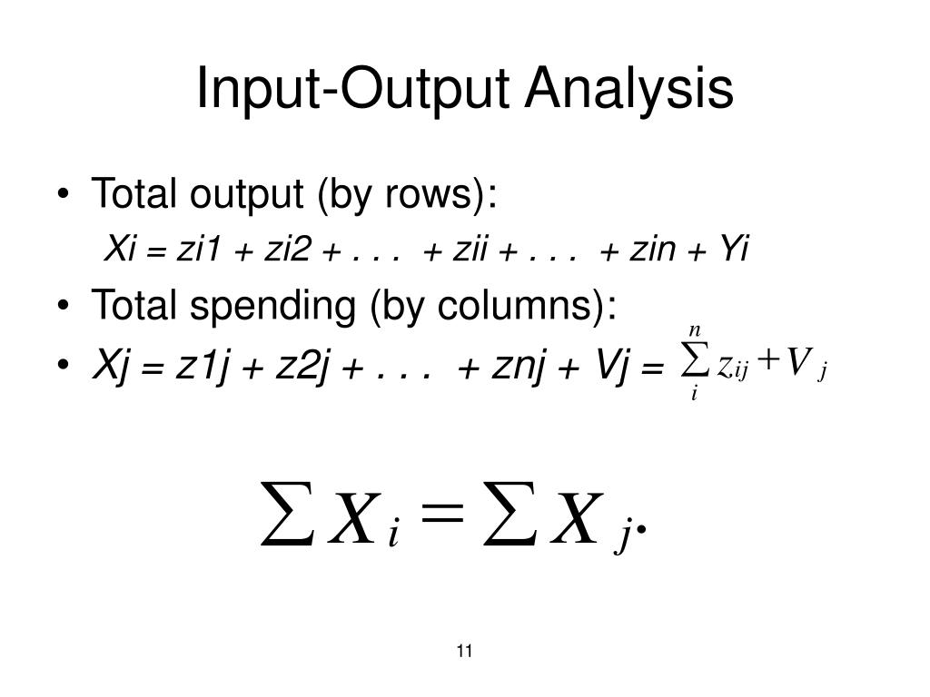 Input-Output Analysis • Total output (by rows): Xi = zi1 + zi2 + . . . + zii + . . . + zin + Yi • Total spending (by columns): • Xj = z1j + z2j + . . . + znj + Vj = 11