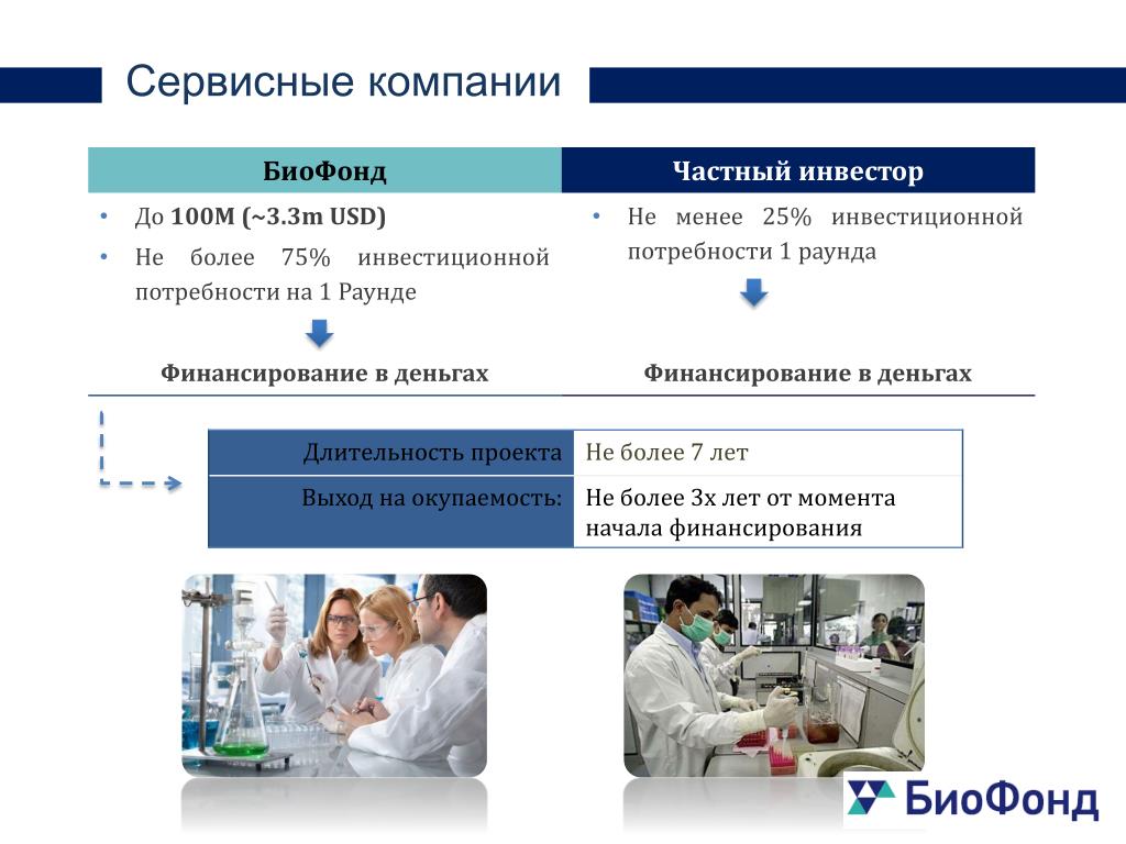 БиоФонд РВК. Цель и задачи Стимулирование формирования в России географически распределенного кластера инновационных и инфраструктурных (био)фармацевтических компаний посредством внедрения в Российскую практику рыночных методов инвестиционного и финансового сотрудничества. Вкраткосрочной перспективе Вдолгосрочной перспективе • Развитие рынка сервисных услуг на уровне лучших мировых практик • Сокращение стоимости процессов разработки инновационной продукции • Ускоренный выход на самоокупаемость компаний сервисной инфраструктуры в биофармацевтическом секторе. • Создание современной инфраструктуры для разработки инновационных продуктов • Снижение инвестиционных рисков • Повышение конкурентоспособности отечественной фармацевтической промышленности • Укрепление принципов частно-государственного партнёрства при инвестировании ООО «Биофармацевтические инвестиции РВК»