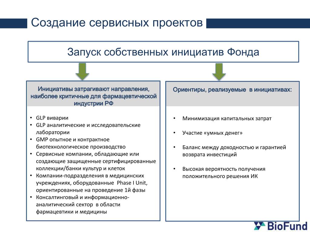Создание сервисных проектов Запуск собственных инициатив Фонда • Инициативы затрагивают направления, наиболее критичные для фармацевтической индустрии РФ • GLP виварии • GLP аналитические и исследовательские лаборатории • GMP опытное и контрактное биотехнологическое производство • Сервисные компании, обладающие или создающие защищенные сертифицированные коллекции/банки культур и клеток • Компании-подразделения в медицинских учреждениях, оборудованные Phase I Unit, ориентированные на проведение 1й фазы • Консалтинговый и информационно-аналитический сектор в области фармацевтики и медицины • Ориентиры, реализуемые в инициативах: • Минимизация капитальных затрат • Участие «умных денег» • Баланс между доходностью и гарантией возврата инвестиций • Высокая вероятность получения положительного решения ИК