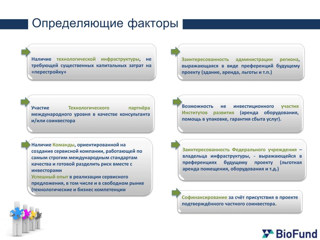 Определяющиефакторы Наличие технологической инфраструктуры,не требующей существенных капитальных затрат на «перестройку» Заинтересованность администрации региона, выражающаяся в виде преференций будущему проекту (здание, аренда, льготы и т.п.) Заинтересованность Федерального учреждения – владельца инфраструктуры, - выражающейся в преференциях будущему проекту (льготная аренда помещения, оборудования и т.д.) Возможность не инвестиционного участия Институтов развития (аренда оборудования, помощь в упаковке, гарантия сбыта услуг). Участие Технологического партнёра международного уровня в качестве консультанта и/или соинвестора • Наличие Команды, ориентированной на создание сервисной компании, работающей по самым строгим международным стандартам качества и готовой разделить риск вместе с инвесторамиУспешный опыт в реализации сервисного предложения, в том числе и в свободном рынке (технологические и бизнес компетенции Софинансированиеза счёт присутствия в проекте подтверждённого частного соинвестора.