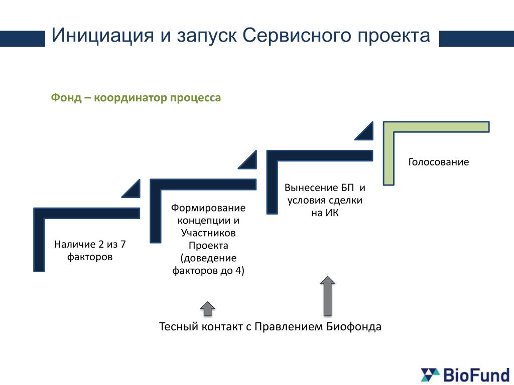 Инициация и запуск Сервисного проекта Фонд – координатор процесса Голосование Тесный контакт с ПравлениемБиофонда