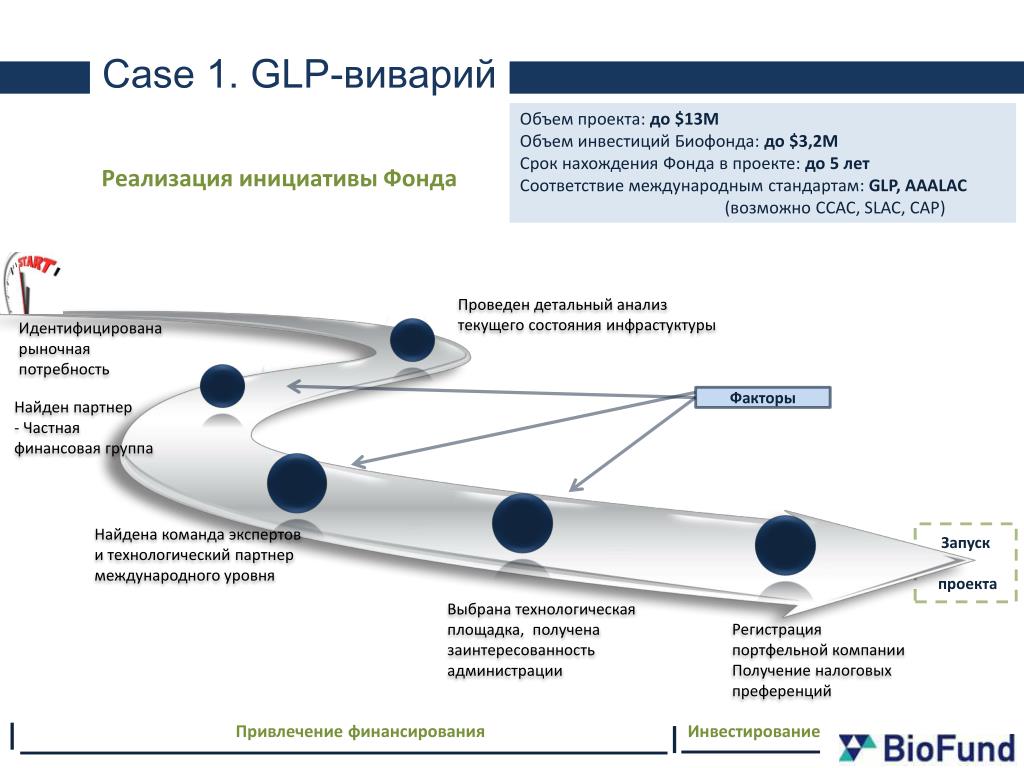 Case 1. GLP-виварий Объем проекта:до $13M Объем инвестиций Биофонда:до $3,2M Срок нахождения Фонда в проекте:до 5 лет Соответствие международным стандартам:GLP, AAALAC(возможно CCAC, SLAC, CAP) Реализация инициативы Фонда Проведен детальный анализ текущего состояния инфрастуктуры Идентифицирована рыночная потребность Факторы Найден партнер - Частная финансовая группа Запуск проекта Найдена команда экспертов и технологический партнер международного уровня Выбрана технологическая площадка, получена заинтересованность администрации Регистрация портфельной компании Получение налоговых преференций Привлечение финансирования Инвестирование