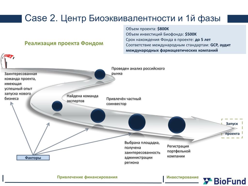 Case 2. Центр Биоэквивалентности и 1й фазы Объем проекта:$800K Объем инвестиций Биофонда:$500K Срок нахождения Фонда в проекте:до 5 лет Соответствие международным стандартам:GCP, аудит международных фармацевтических компаний Реализация проекта Фондом Проведен анализ российского рынка Заинтересованная команда проекта, имеющая успешный опыт запуска нового бизнеса Найдена командаэкспертов Привлечён частный соинвестор Запуск проекта Регистрация портфельной компании Выбрана площадка, получена заинтересованность администрации региона Факторы Привлечение финансирования Инвестирование