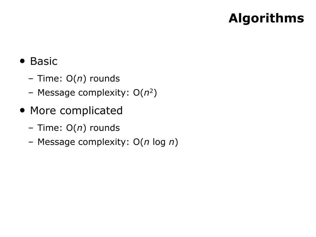 Algorithms • Basic • Time: O(n) rounds • Message complexity: O(n2) • More complicated • Time: O(n) rounds • Message complexity: O(n log n)