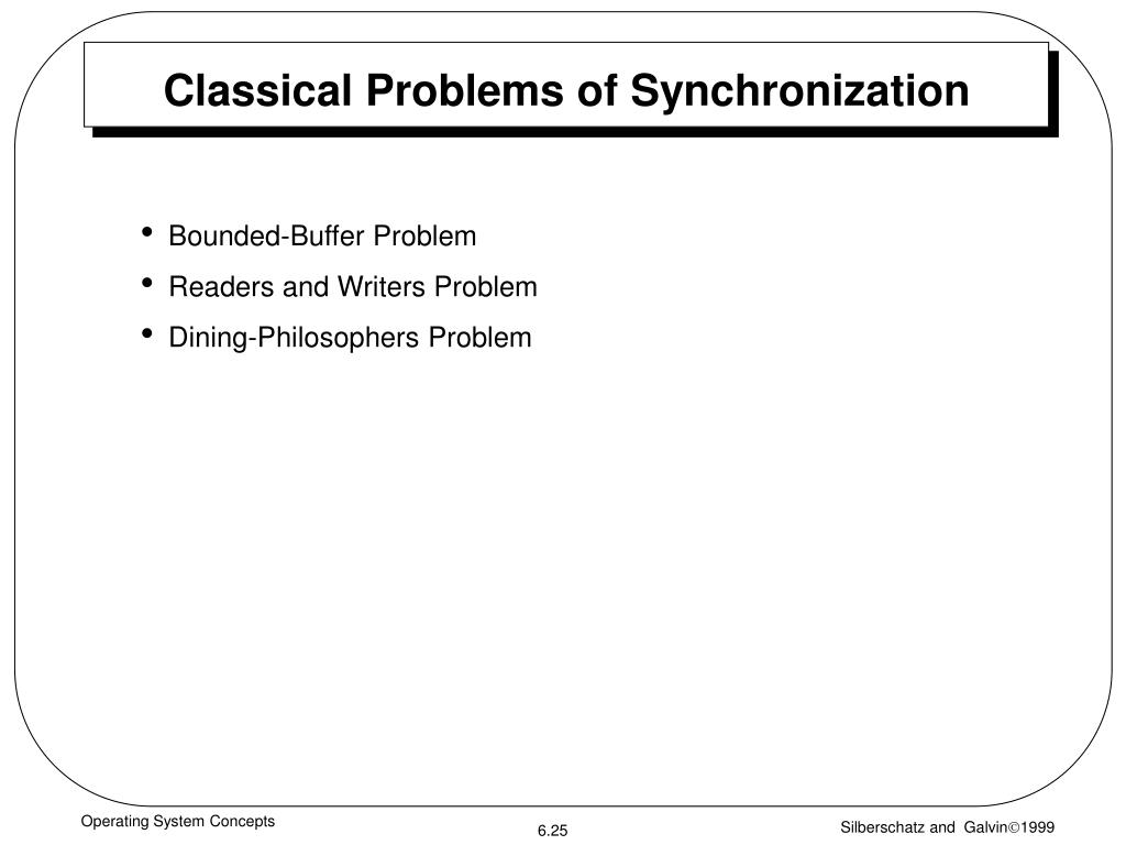 Classical Problems of Synchronization • Bounded-Buffer Problem • Readers and Writers Problem • Dining-Philosophers Problem Operating System Concepts