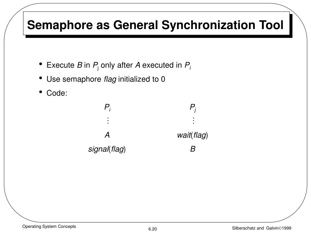 Semaphore as General Synchronization Tool • Execute B in Pj only after A executed in Pi • Use semaphore flag initialized to 0 • Code: Pi Pj Await(flag) signal(flag) B Operating System Concepts