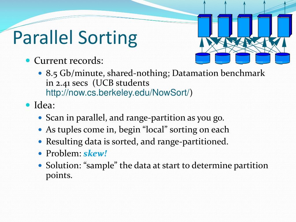 Parallel Sorting • Current records: • 8.5 Gb/minute, shared-nothing; Datamation benchmark in 2.41 secs (UCB students http://now.cs.berkeley.edu/NowSort/) • Idea: • Scan in parallel, and range-partition as you go. • As tuples come in, begin “local” sorting on each • Resulting data is sorted, and range-partitioned. • Problem:skew! • Solution: “sample” the data at start to determine partition points.