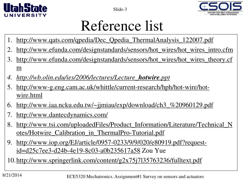 Reference list • http://www.qats.com/qpedia/Dec_Qpedia_ThermalAnalysis_122007.pdf • http://www.efunda.com/designstandards/sensors/hot_wires/hot_wires_intro.cfm • http://www.efunda.com/designstandards/sensors/hot_wires/hot_wires_theory.cfm • http://wb.olin.edu/ies/2006/lectures/Lecture_hotwire.ppt • http://www-g.eng.cam.ac.uk/whittle/current-research/hph/hot-wire/hot-wire.html • http://www.iaa.ncku.edu.tw/~jjmiau/exp/download/ch3_%20960129.pdf • http://www.dantecdynamics.com/ • http://www.tsi.com/uploadedFiles/Product_Information/Literature/Technical_Notes/Hotwire_Calibration_in_ThermalPro-Tutorial.pdf • http://www.iop.org/EJ/article/0957-0233/9/9/020/e80919.pdf?request-id=d25c7ee3-d24b-4e19-8c03-a0b235617a58 Zou Yue • http://www.springerlink.com/content/g2x75j7l35763236/fulltext.pdf ECE5320 Mechatronics. Assignment#1 Survey on sensors and actuators