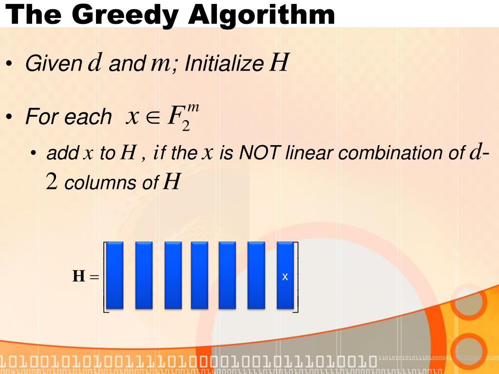 The Greedy Algorithm • Given d and m; Initialize H • For each • add x to H , if the x is NOT linear combination of d-2 columns of H x