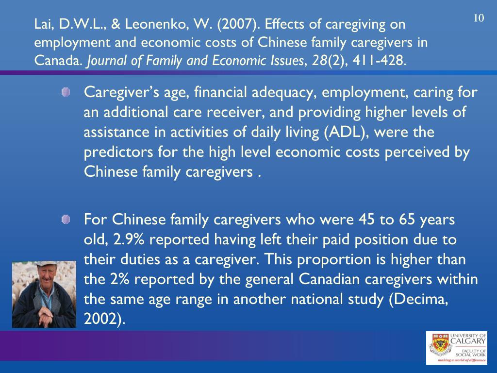 Lai, D.W.L., & Leonenko, W. (2007). Effects of caregiving on employment and economic costs of Chinese family caregivers in Canada. Journal of Family and Economic Issues, 28(2), 411-428. • Caregiver’s age, financial adequacy, employment, caring for an additional care receiver, and providing higher levels of assistance in activities of daily living (ADL), were the predictors for the high level economic costs perceived by Chinese family caregivers . • For Chinese family caregivers who were 45 to 65 years old, 2.9% reported having left their paid position due to their duties as a caregiver. This proportion is higher than the 2% reported by the general Canadian caregivers within the same age range in another national study (Decima, 2002).