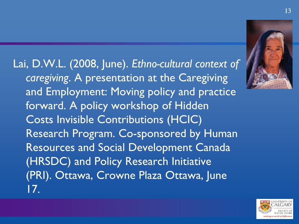 Lai, D.W.L. (2008, June). Ethno-cultural context of caregiving. A presentation at the Caregiving and Employment: Moving policy and practice forward. A policy workshop of Hidden Costs Invisible Contributions (HCIC) Research Program. Co-sponsored by Human Resources and Social Development Canada (HRSDC) and Policy Research Initiative (PRI). Ottawa, Crowne Plaza Ottawa, June 17.