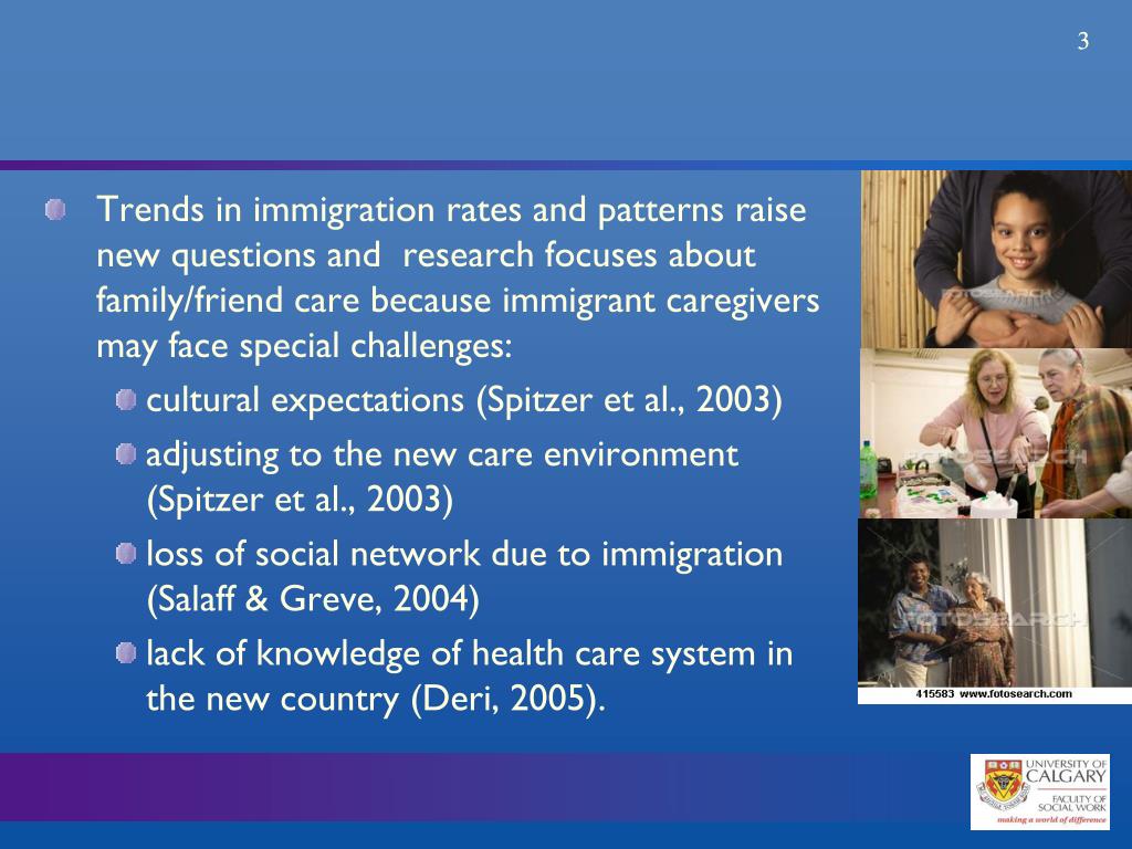 Trends in immigration rates and patterns raise new questions and research focuses about family/friend care because immigrant caregivers may face special challenges: • cultural expectations (Spitzer et al., 2003) • adjusting to the new care environment (Spitzer et al., 2003) • loss of social network due to immigration (Salaff & Greve, 2004) • lack of knowledge of health care system in the new country (Deri, 2005).