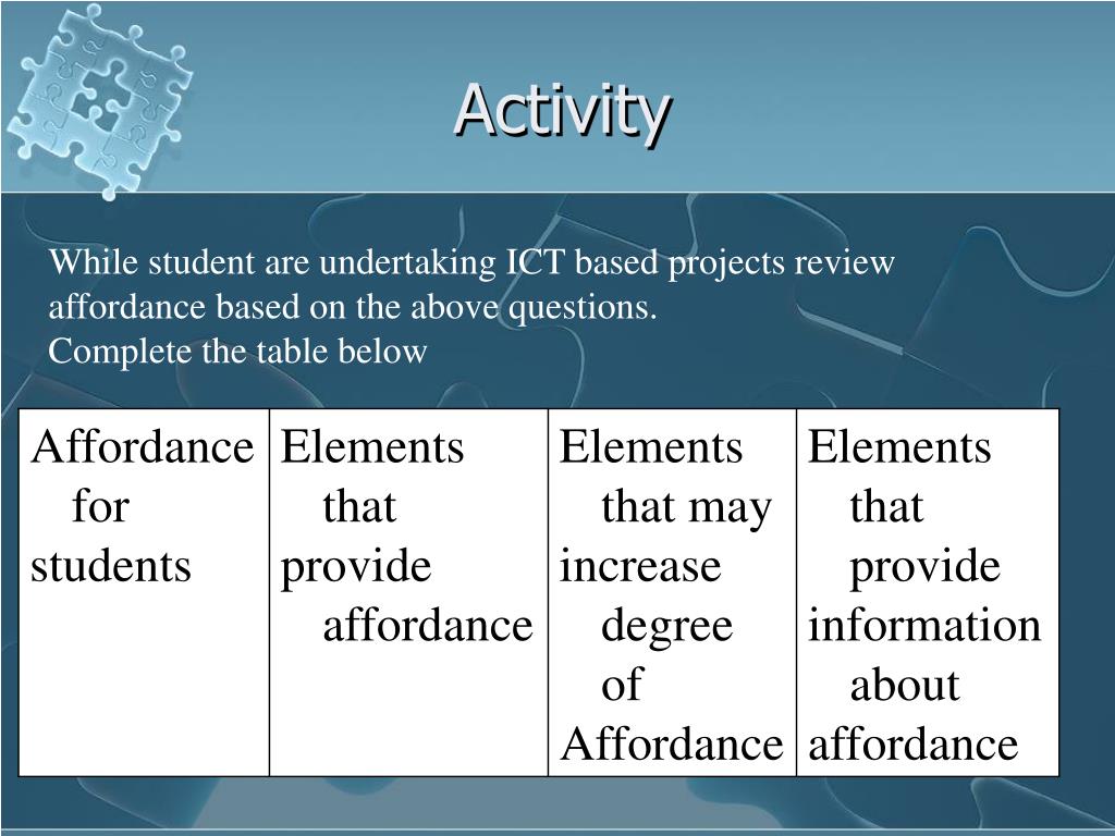 Activity While student are undertaking ICT based projects review affordance based on the above questions. Complete the table below