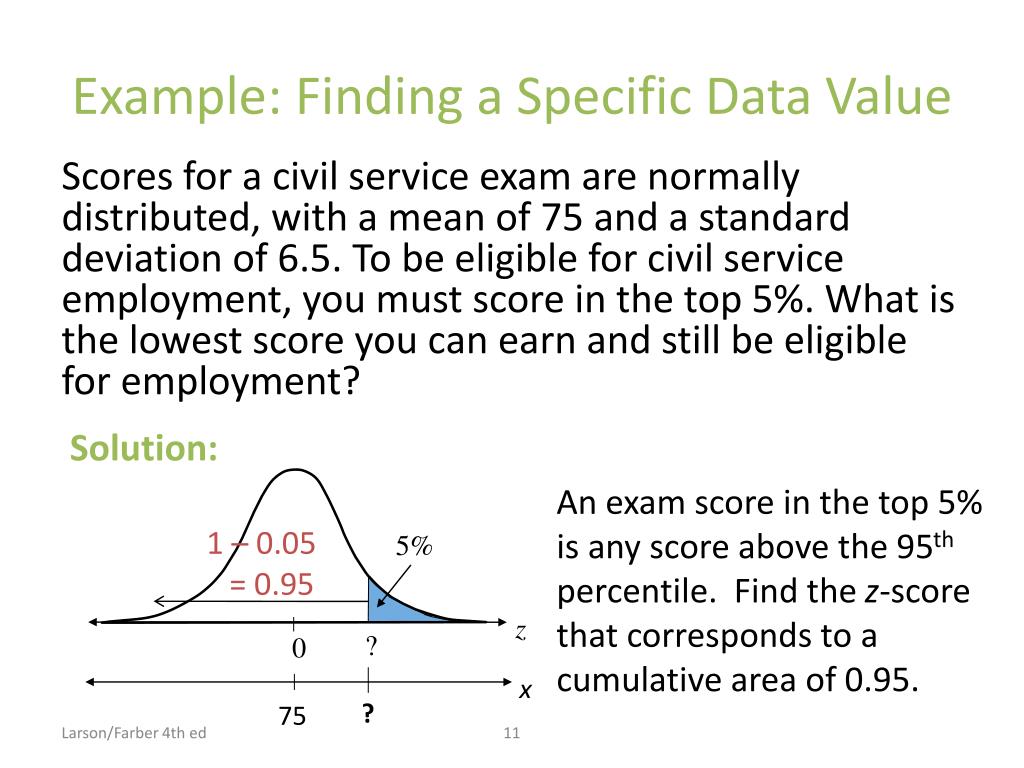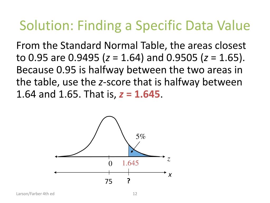 5% x ? 75 Solution: Finding a Specific Data Value From the Standard Normal Table, the areas closest to 0.95 are 0.9495 (z = 1.64) and 0.9505 (z = 1.65). Because 0.95 is halfway between the two areas in the table, use the z-score that is halfway between 1.64 and 1.65. That is, z = 1.645. z 1.645 0 Larson/Farber 4th ed