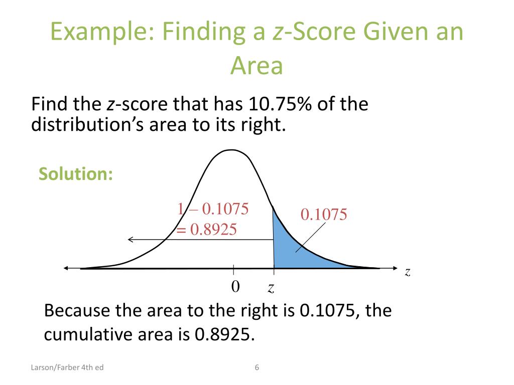 Solution: Finding a z-Score Given an Area • Locate 0.8925 in the body of the Standard Normal Table. The z-score is 1.24. • The values at the beginning of the corresponding row and at the top of the column give the z-score. Larson/Farber 4th ed