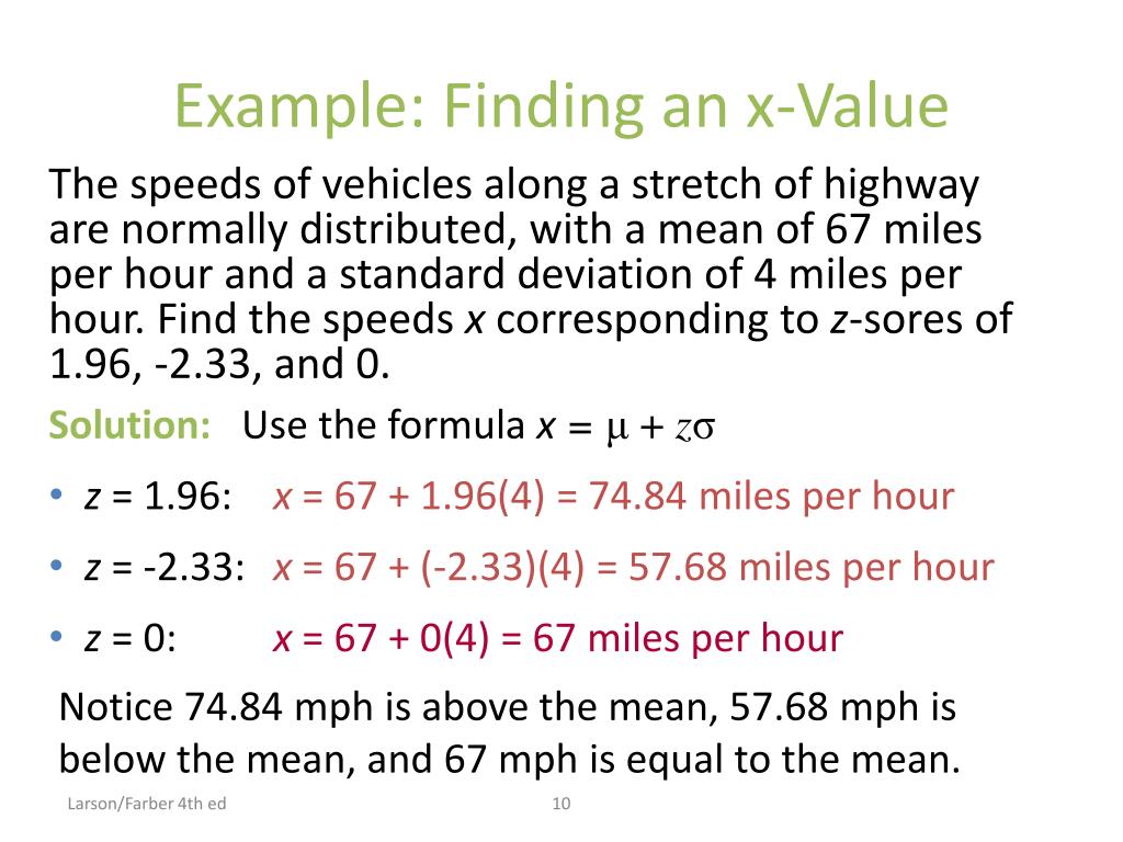 Example: Finding an x-Value The speeds of vehicles along a stretch of highway are normally distributed, with a mean of 67 miles per hour and a standard deviation of 4 miles per hour. Find the speeds x corresponding to z-sores of 1.96, -2.33, and 0. • Solution: Use the formula x = μ + zσ • z = 1.96: x = 67 + 1.96(4) = 74.84 miles per hour • z = -2.33: x = 67 + (-2.33)(4) = 57.68 miles per hour • z = 0: x = 67 + 0(4) = 67 miles per hour Notice 74.84 mph is above the mean, 57.68 mph is below the mean, and 67 mph is equal to the mean. Larson/Farber 4th ed