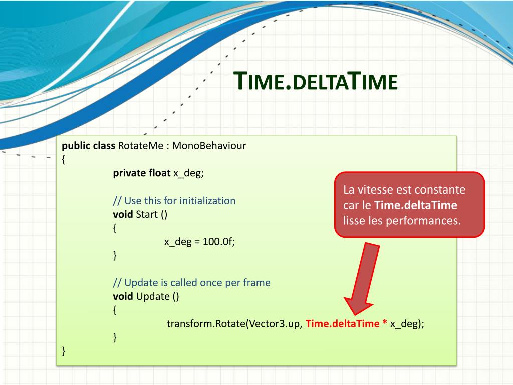publicclassRotateMe : MonoBehaviour { privatefloatx_deg; // Use this for initialization void Start () { x_deg = 100.0f; } // Update is called once per frame void Update () { transform.Rotate(Vector3.up, Time.deltaTime * x_deg); } } Time.deltaTime La vitesse est constante car le Time.deltaTime lisse les performances.
