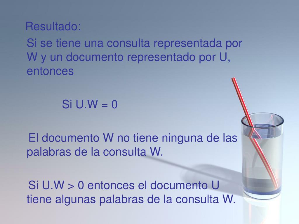 Resultado: Si se tiene una consulta representada por W y un documento representado por U, entonces Si U.W = 0 El documento W no tiene ninguna de las palabras de la consulta W. Si U.W > 0 entonces el documento U tiene algunas palabras de la consulta W.