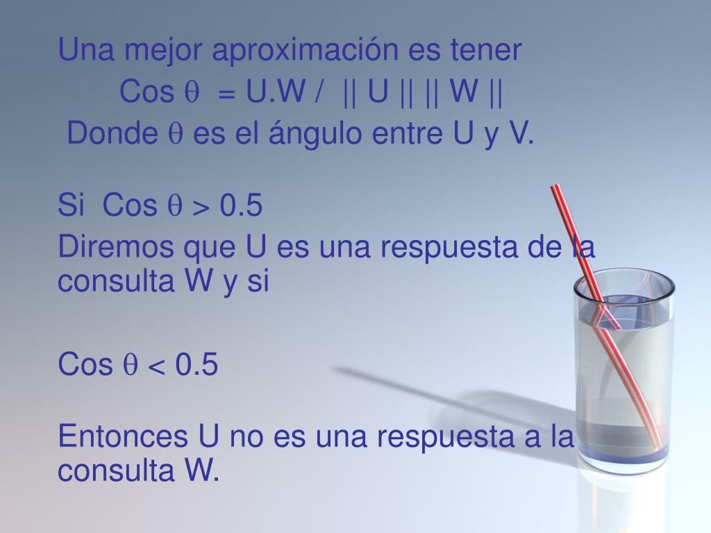 Una mejor aproximación es tener Cos = U.W / || U || || W || Donde es el ángulo entre U y V. Si Cos > 0.5 Diremos que U es una respuesta de la consulta W y si Cos < 0.5 Entonces U no es una respuesta a la consulta W.