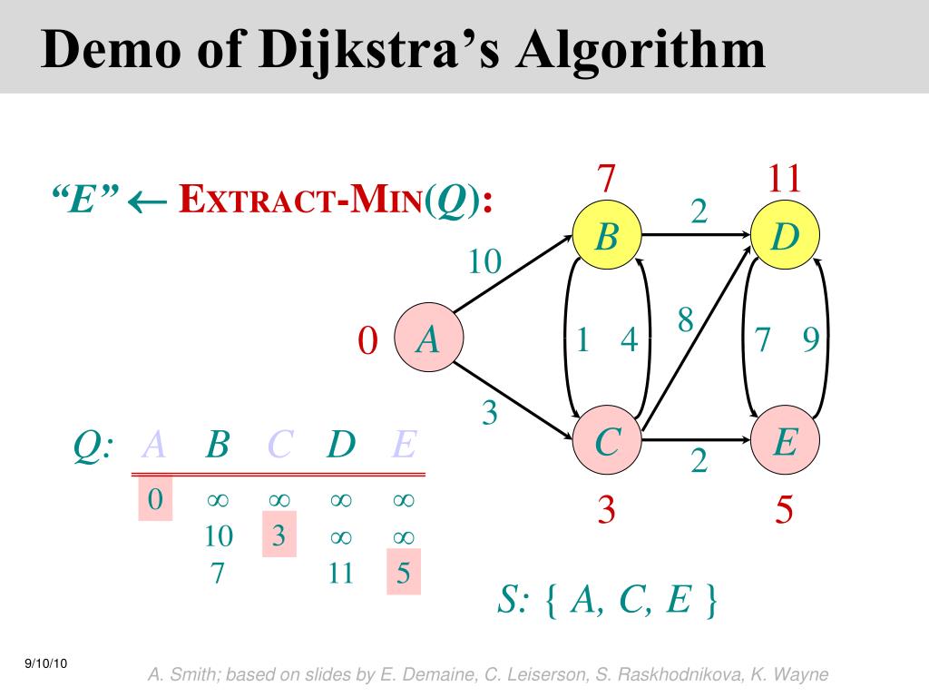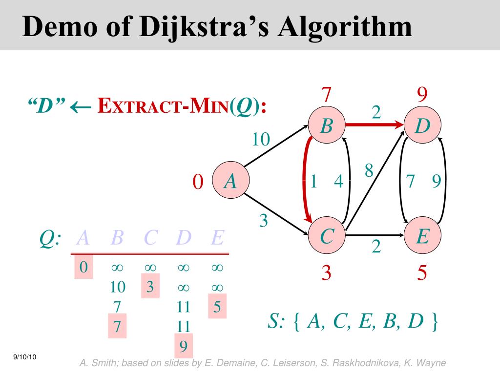 Demo of Dijkstra’s Algorithm ¥ ¥ “A”EXTRACT-MIN(Q): 2 B D 10 8 A 0 1 4 7 9 3 C E Q: A B C D E 2 ¥ ¥ ¥ ¥ 0 ¥ ¥ S: { A } A. Smith; based on slides by E. Demaine, C. Leiserson, S. Raskhodnikova, K. Wayne