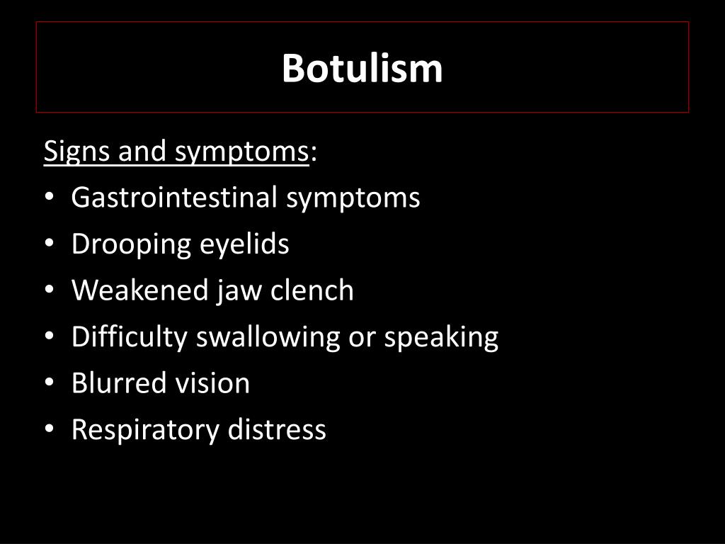 Botulism Signs and symptoms: • Gastrointestinal symptoms • Drooping eyelids • Weakened jaw clench • Difficulty swallowing or speaking • Blurred vision • Respiratory distress
