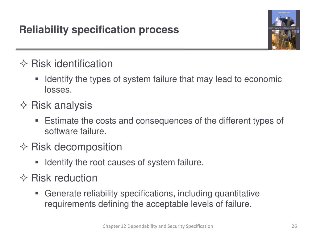 Reliability specification process • Risk identification • Identify the types of system failure that may lead to economic losses. • Risk analysis • Estimate the costs and consequences of the different types of software failure. • Risk decomposition • Identify the root causes of system failure. • Risk reduction • Generate reliability specifications, including quantitative requirements defining the acceptable levels of failure. Chapter 12 Dependability and Security Specification