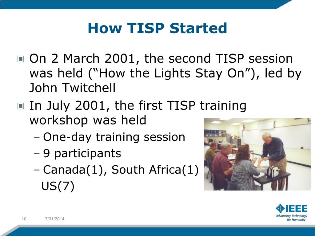 How TISP Started • On 2 March 2001, the second TISP session was held (“How the Lights Stay On”), led by John Twitchell • In July 2001, the first TISP training workshop was held • One-day training session • 9 participants • Canada(1), South Africa(1) US(7)