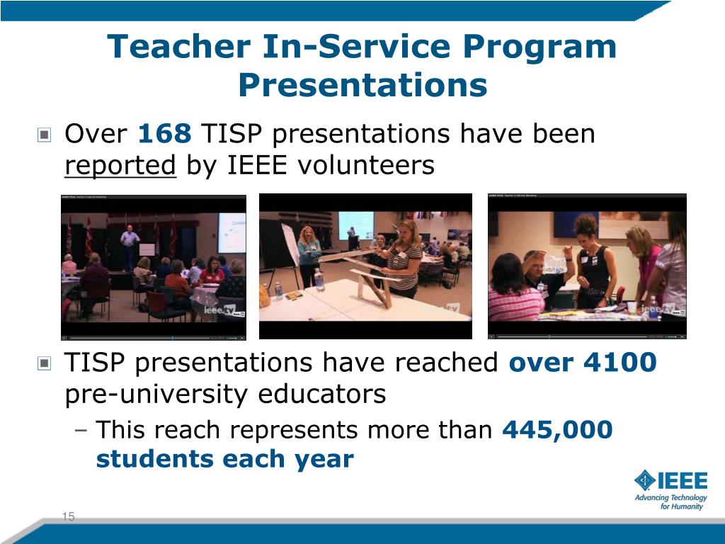 Training Workshops: 2005-Present 25 Workshops - 2203 Participants www.ieee.org/education_careers/education/preuniversity/tispt/tispworkshops.html