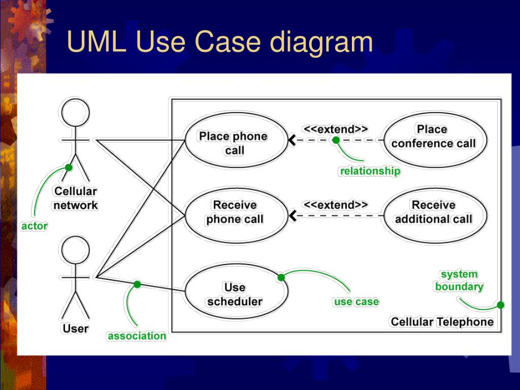 UML Use Case diagram • Actors • play system role • may not be people • Use case • like a scenario • Relationships • include • extend • generalisation
