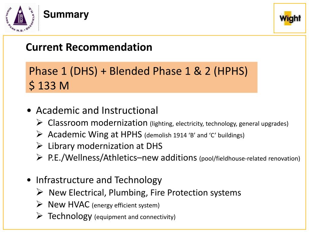 Summary • Academic and Instructional • Classroom modernization (lighting, electricity, technology, general upgrades) • Academic Wing at HPHS (demolish 1914 ‘B’ and ‘C’ buildings) • Library modernization at DHS • P.E./Wellness/Athletics–new additions (pool/fieldhouse-related renovation) • Infrastructure and Technology • New Electrical, Plumbing, Fire Protection systems • New HVAC (energy efficient system) • Technology (equipment and connectivity) Phase 1 (DHS) + Blended Phase 1 & 2 (HPHS) $ 133 M Current Recommendation