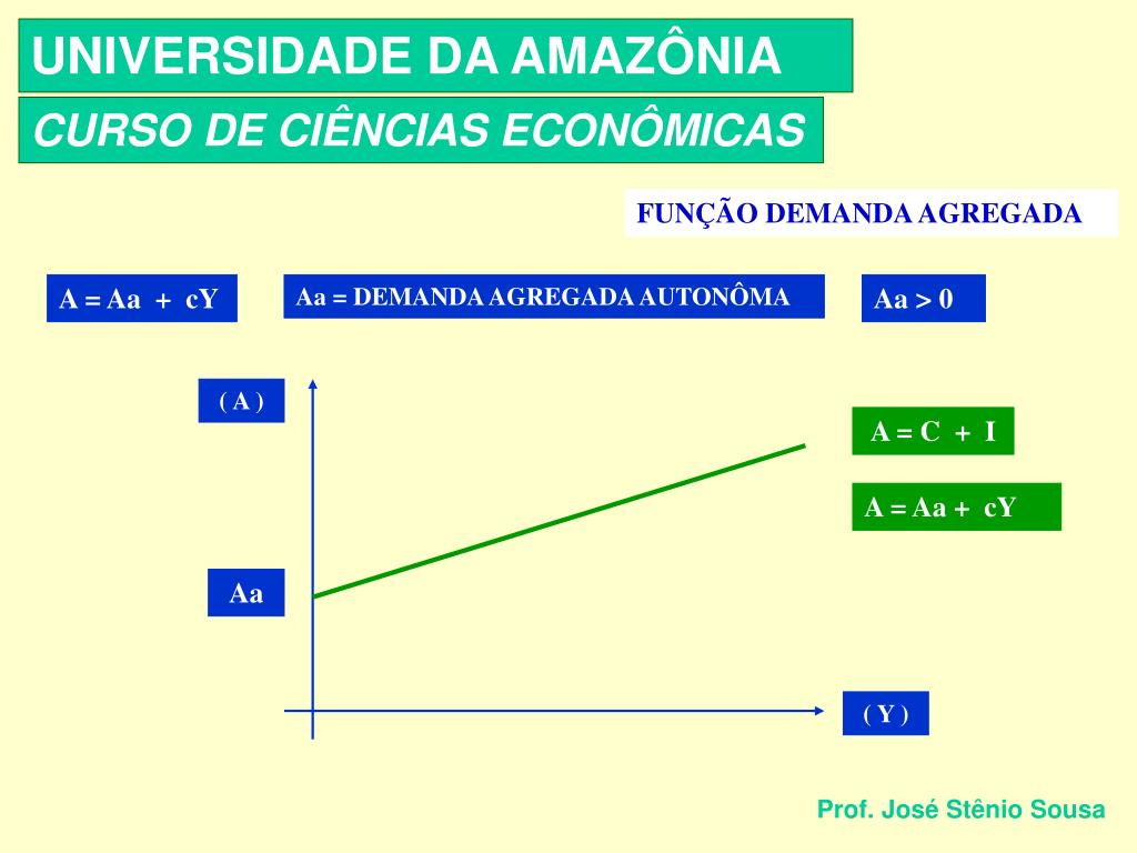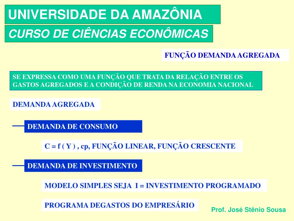 UNIVERSIDADE DA AMAZÔNIA. CURSO DE CIÊNCIAS ECONÔMICAS. A FUNÇÃO DEMANDA AGREGADA. PROPOSIÇÃO KEYNESIANA. Prof. José Stênio Sousa. DEMANDA DE CONSUMO. DEMANDA DE INVESTIMENTO. UNIVERSIDADE DA AMAZÔNIA. CURSO DE CIÊNCIAS ECONÔMICAS. FUNÇÃO DEMANDA AGREGADA.