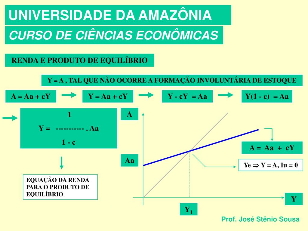 A Ye Y = A, Iu = 0 EQUAÇÃO DA RENDA PARA O PRODUTO DE EQUILÍBRIO Y UNIVERSIDADE DA AMAZÔNIA CURSO DE CIÊNCIAS ECONÔMICAS RENDA E PRODUTO DE EQUILÍBRIO Y = A , TAL QUE NÃO OCORRE A FORMAÇÃO INVOLUNTÁRIA DE ESTOQUE A = Aa + cY Y = Aa + cY Y - cY = Aa Y(1 - c) = Aa 1 Y = ----------- . Aa 1 - c A = Aa + cY Aa Y1 Prof. José Stênio Sousa