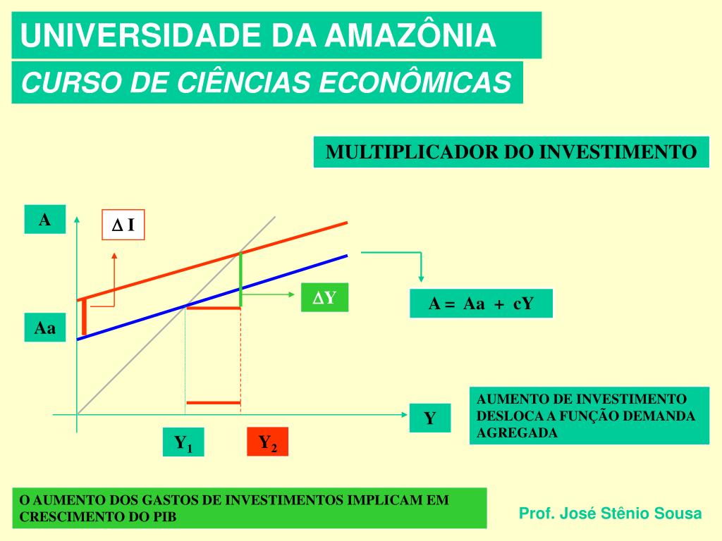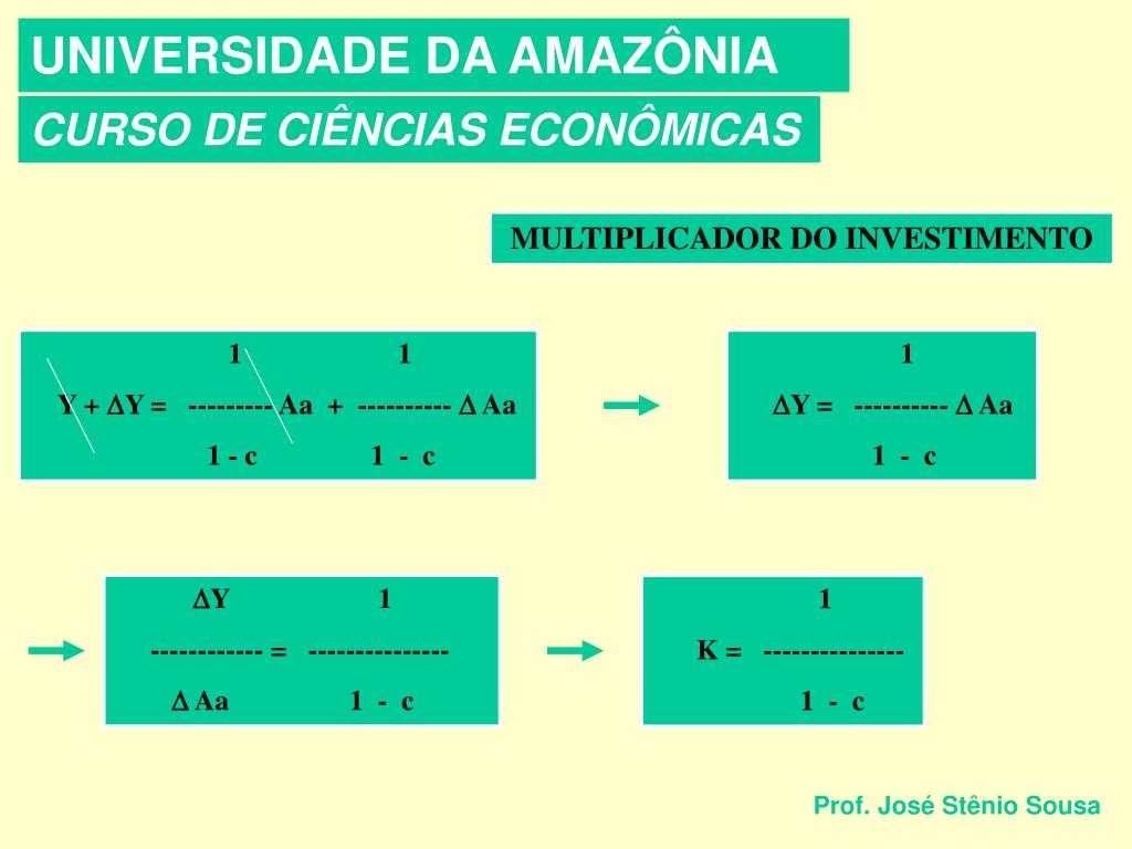 UNIVERSIDADE DA AMAZÔNIA CURSO DE CIÊNCIAS ECONÔMICAS MULTIPLICADOR DO INVESTIMENTO 1 Y = ----------- . Aa 1 - c SE I Aa Y 1 Y + Y = ------------ ( Aa + Aa ) 1 - c 1 1 Y + Y = ---------Aa + ---------- Aa 1 - c 1 - c 1 Y = ----------- . Aa 1 - c COMO Prof. José Stênio Sousa