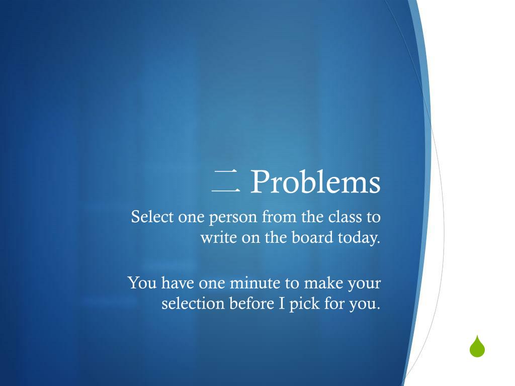二 Problems Select one person from the class to write on the board today. You have one minute to make your selection before I pick for you.