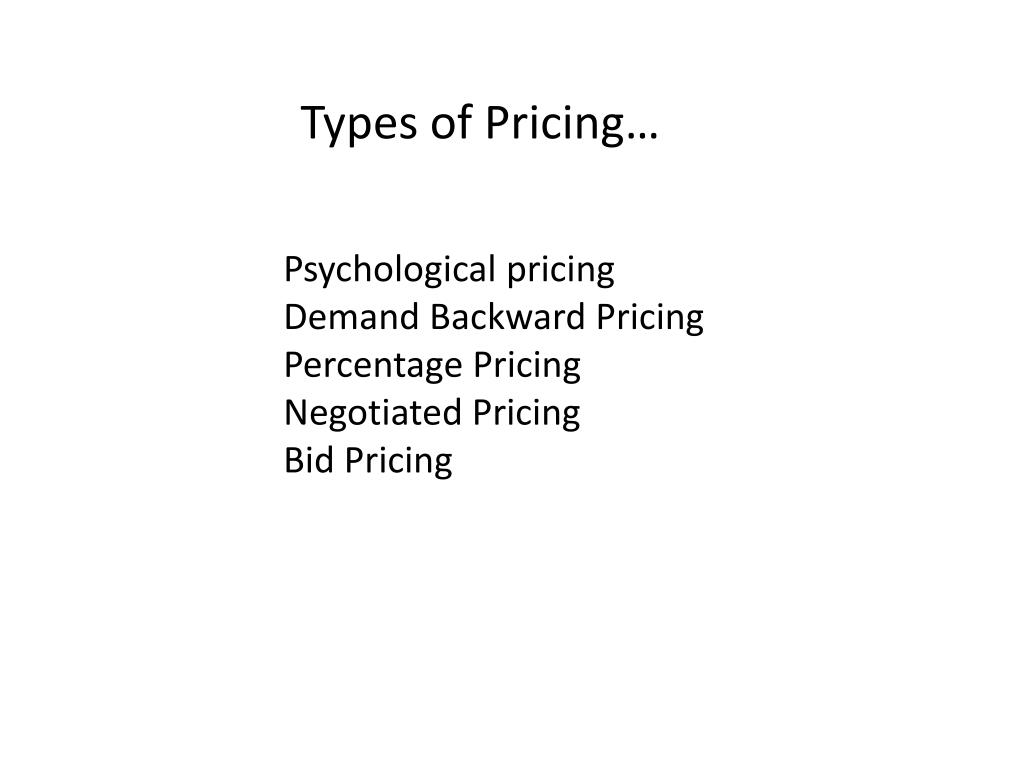 Types of Pricing… Psychological pricing Demand Backward Pricing Percentage Pricing Negotiated Pricing Bid Pricing