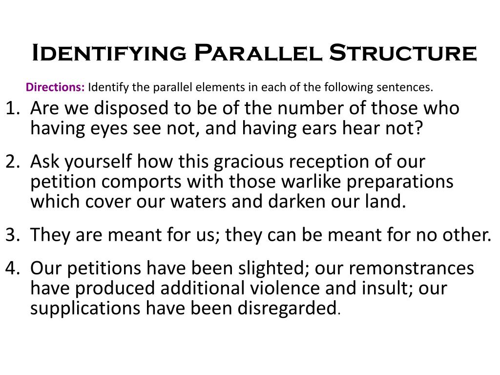 Identifying Parallel Structure Directions:Identify the parallel elements in each of the following sentences. • Are we disposed to be of the number of those who having eyes see not, and having ears hear not? • Ask yourself how this gracious reception of our petition comports with those warlike preparations which cover our waters and darken our land. • They are meant for us; they can be meant for no other. • Our petitions have been slighted; our remonstrances have produced additional violence and insult; our supplications have been disregarded.