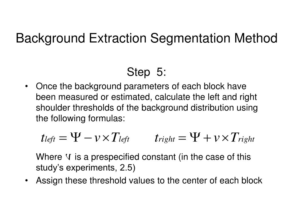 Background Extraction Segmentation Method • Step 5: • Once the background parameters of each block have been measured or estimated, calculate the left and right shoulder thresholds of the background distribution using the following formulas: • Where is a prespecified constant (in the case of this study’s experiments, 2.5) • Assign these threshold values to the center of each block