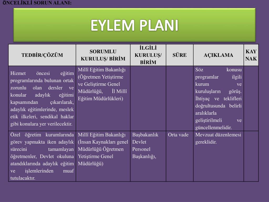 ÖNCELİKLİ SORUN ALANI: EYLEM PLANI