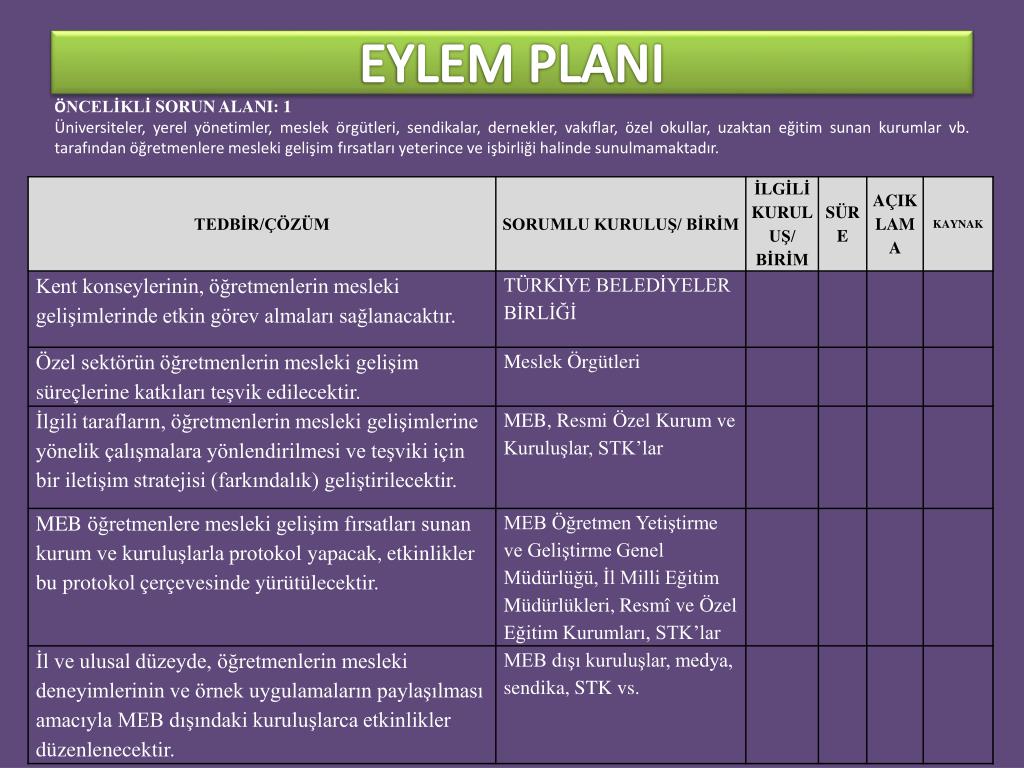 EYLEM PLANI ÖNCELİKLİ SORUN ALANI: 1 Üniversiteler, yerel yönetimler, meslek örgütleri, sendikalar, dernekler, vakıflar, özel okullar, uzaktan eğitim sunan kurumlar vb. tarafından öğretmenlere mesleki gelişim fırsatları yeterince ve işbirliği halinde sunulmamaktadır.
