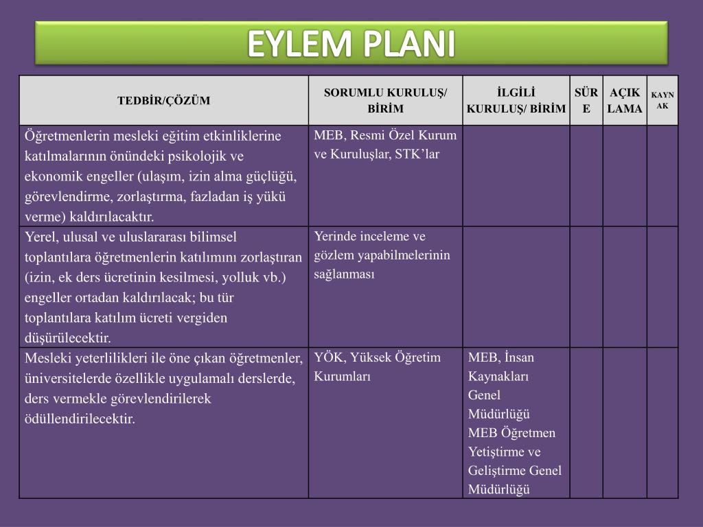 EYLEM PLANI ÖNCELİKLİ SORUN ALANI: 2 MEB dışında mesleki gelişim etkinliklerine katılımı özendiren yasal düzenlemeler yok. Yasal düzenlemeler bu etkinliklere katılımı kolaylaştırmamaktadır. MEB dışı mesleki gelişim fırsatlarını değerlendirmek için prosedürler teşvik edici değil.