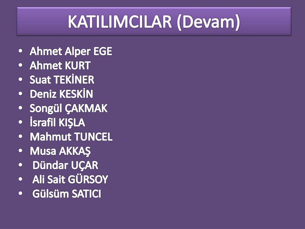KATILIMCILAR (Devam) • Ahmet Alper EGE • Ahmet KURT • Suat TEKİNER • Deniz KESKİN • Songül ÇAKMAK • İsrafil KIŞLA • Mahmut TUNCEL • Musa AKKAŞ • Dündar UÇAR • Ali Sait GÜRSOY • Gülsüm SATICI