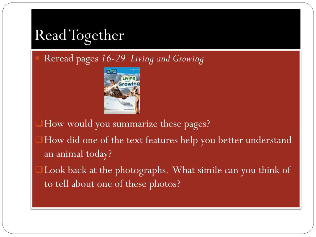Read Together • Reread pages 16-29 Living and Growing • How would you summarize these pages? • How did one of the text features help you better understand an animal today? • Look back at the photographs. What simile can you think of to tell about one of these photos?
