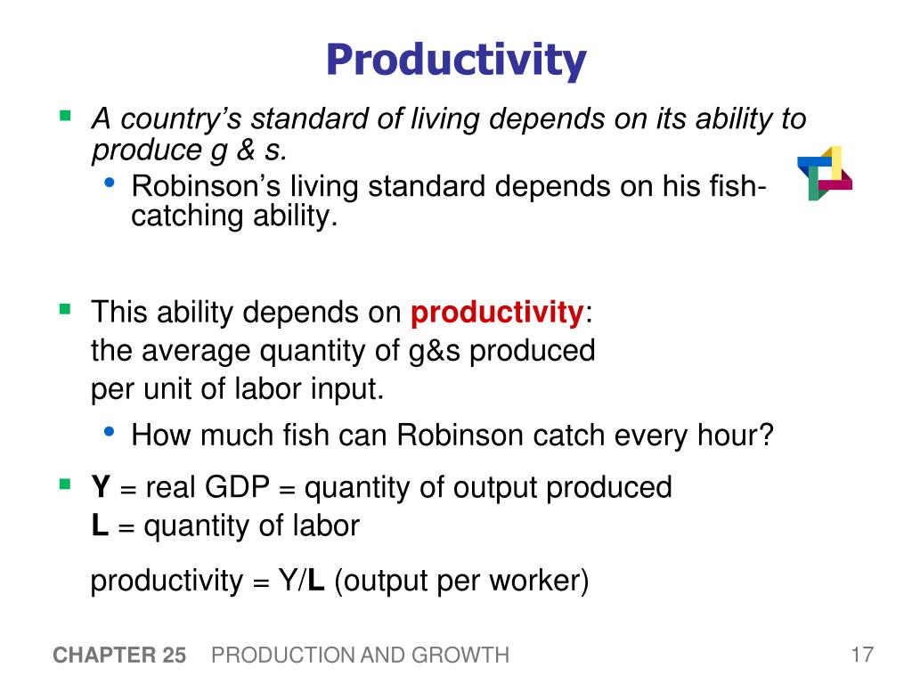 Productivity • A country’s standard of living depends on its ability to produce g & s. • Robinson’s living standard depends on his fish-catching ability. • This ability depends on productivity: the average quantity of g&s produced per unit of labor input. • How much fish can Robinson catch every hour? • Y = real GDP = quantity of output producedL = quantity of labor productivity = Y/L (output per worker) CHAPTER 25 PRODUCTION AND GROWTH