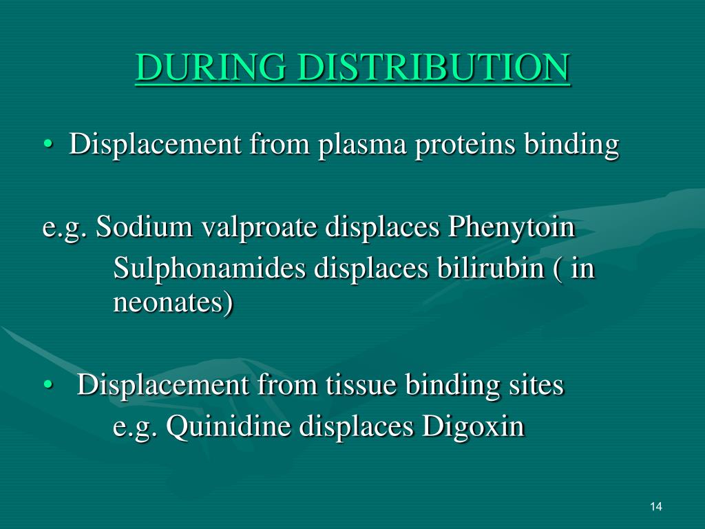 DURING DISTRIBUTION • Displacement from plasma proteins binding e.g. Sodium valproate displaces Phenytoin Sulphonamides displaces bilirubin ( in neonates) • Displacement from tissue binding sites e.g. Quinidine displaces Digoxin